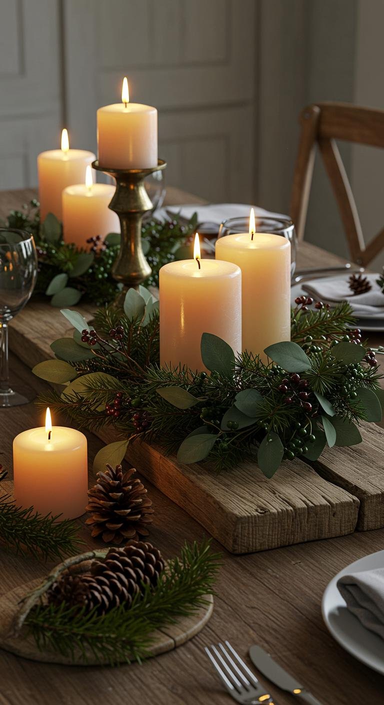 There’s nothing like a candle centerpiece to instantly warm up your dining table during Christmas. Use candles of different heights arranged on a wooden tray, and surround them with pinecones and sprigs of fresh greenery. For a little DIY flair, tie burlap around the smaller candles, and toss in some seasonal berries for a pop of color. It’s simple, elegant, and makes everyone want to gather around and share stories.