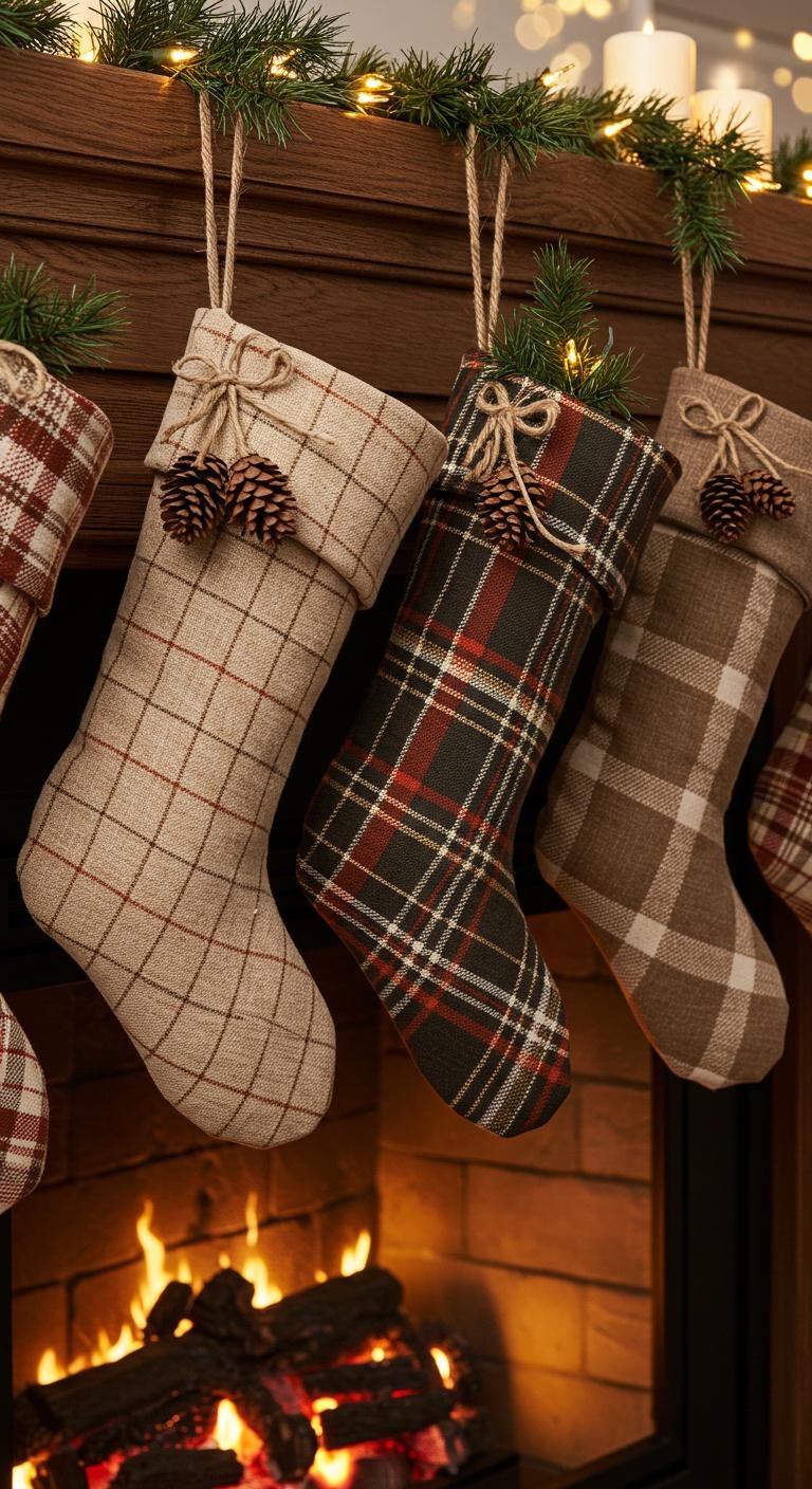Why not craft stockings that fit your rustic vibe? Felt and burlap are great materials for stockings that feel warm and handmade. You can personalize each one with initials using fabric paint, then hang them along a wooden mantel or staircase. It’s a fun family project that adds to the holiday charm and won’t cost much.
