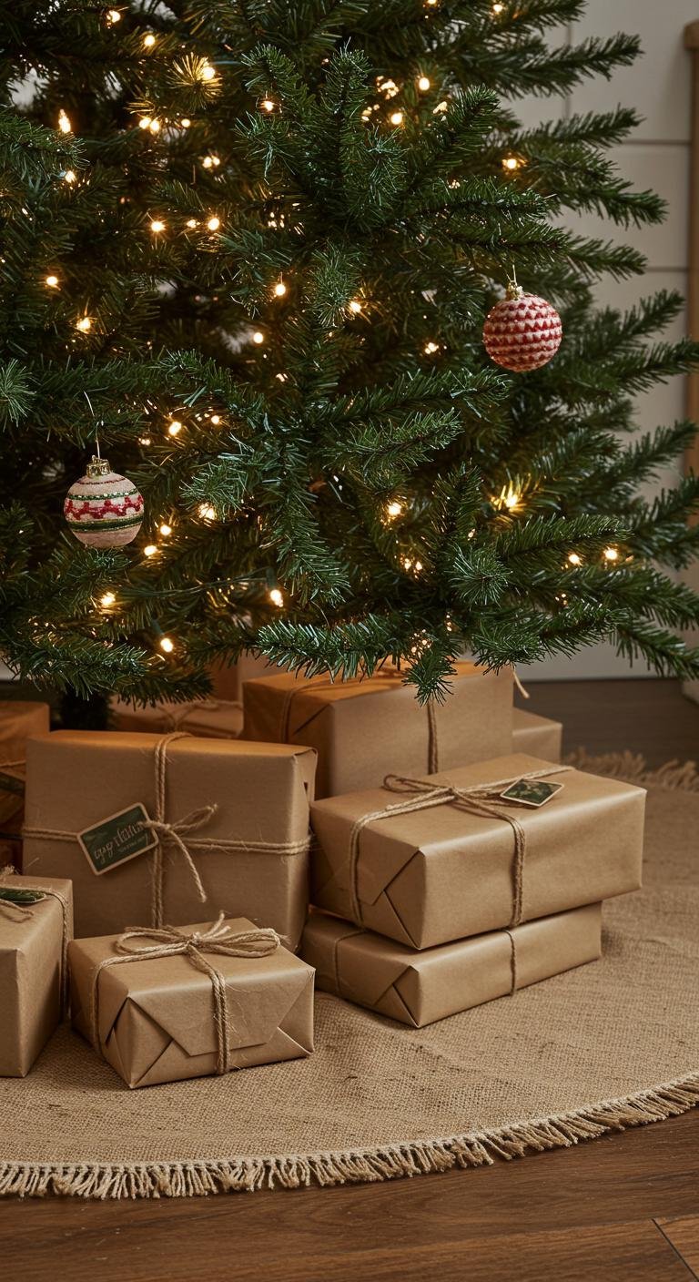 The base of your tree deserves some love too. A rustic tree skirt made of burlap or a soft fabric in earthy tones really ties the whole look together. Cut it into a circle and add some fringed edges for texture. You can even decorate with pinecones or tiny branches. It’s a quick, cheap DIY that completes your tree’s holiday vibe.