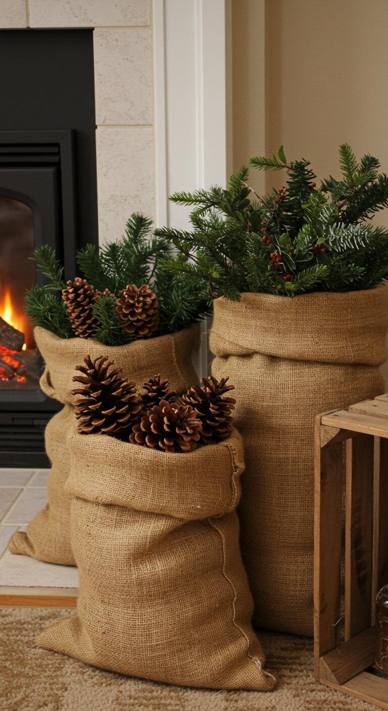 Jute and burlap are the unsung heroes of rustic decor, adding that rough-and-ready texture that feels both warm and polished. Use these fabrics as table runners, wrap them around vases, or fashion tree skirts. Fill burlap sacks with pinecones or fruits and display them on your mantel or dining table. They’re affordable, versatile, and great for simple DIY projects.