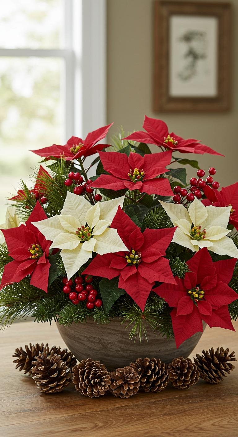 Poinsettias pretty much scream holiday season, right? They’re like the OG Christmas flower, bringing instant traditional vibes to any rustic setup. I love the idea of using a handcrafted bowl—it gives the arrangement a special, one-of-a-kind feel. Mixing red and white poinsettias adds that perfect pop of contrast. Surround your flowers with pinecones and lush evergreen sprigs for that natural, textural boost. Plus, this style won’t break the bank—you can grab flowers from your local market and repurpose vintage containers you already have. It’s all about making it yours and letting your holiday spirit shine through!
