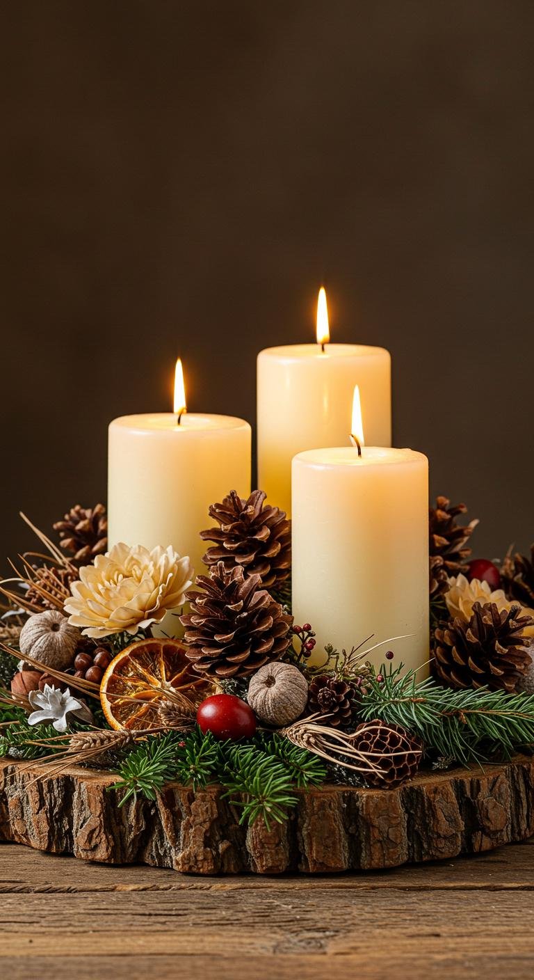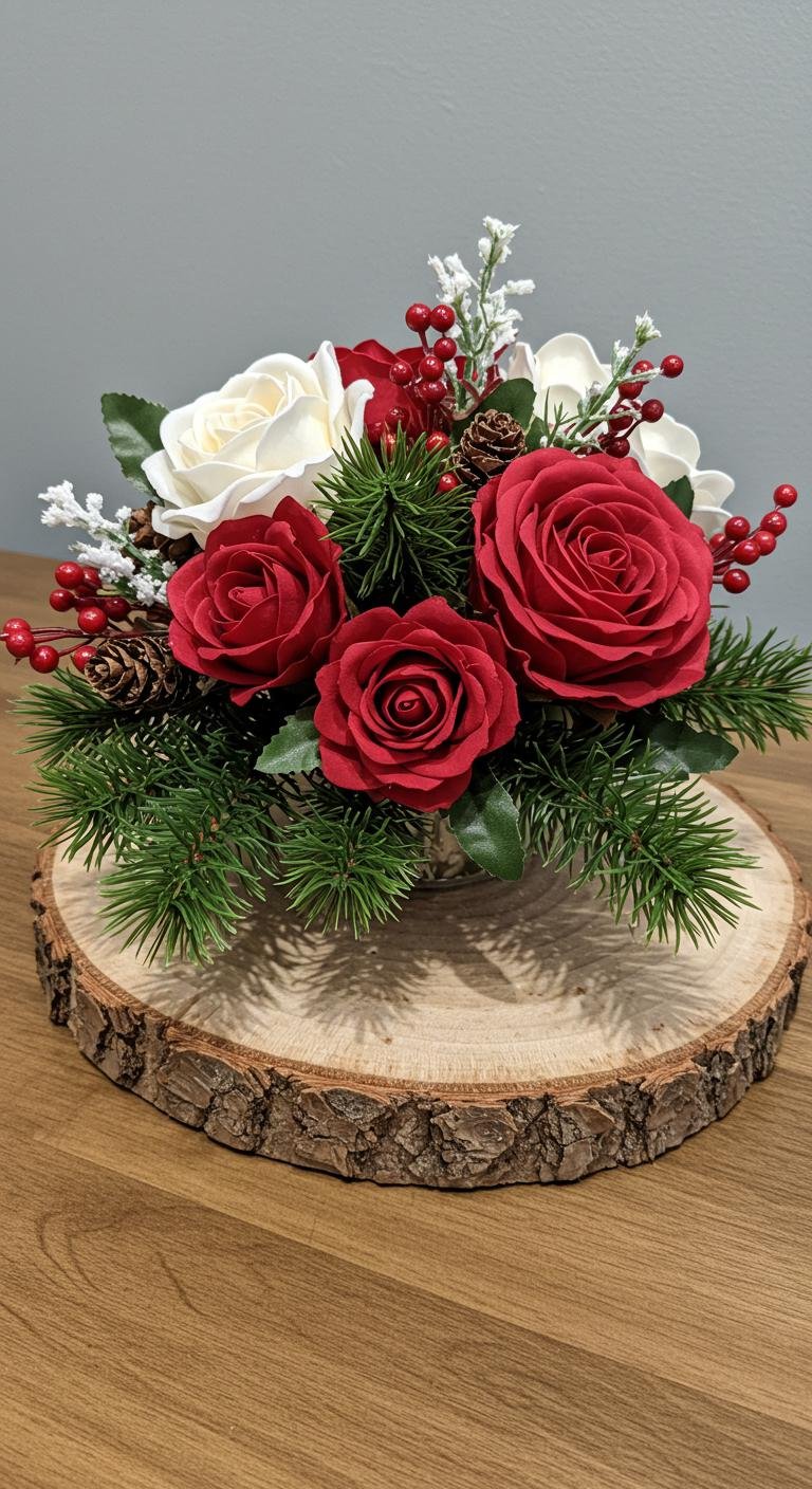 Using wood slices as bases for your arrangements is such a cool way to keep everything feeling natural. Wood rounds can often be found at craft stores or you can DIY by cutting your own. Arrange bright red and white flowers mixed with greenery on top for a simple yet striking centerpiece. The natural grain and warmth of the wood really elevate the rustic vibe, making your holiday table feel like a cozy woodland retreat.