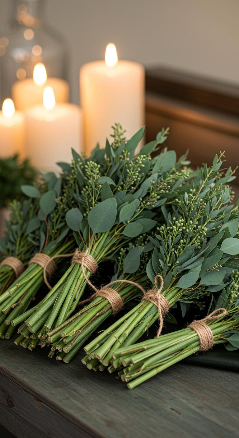 If you want an arrangement that smells as good as it looks, sweetgrass and eucalyptus are your dream team. Tied up in bunches with twine, these greens make for a simple yet elegant rustic display. You can put them in a vase or just lay them flat as a natural runner down the table. Both sweetgrass and eucalyptus are pretty easy to find at local markets or grocery stores. They bring this fresh, calming scent and breezy vibe that’s perfect for holiday chill time.
