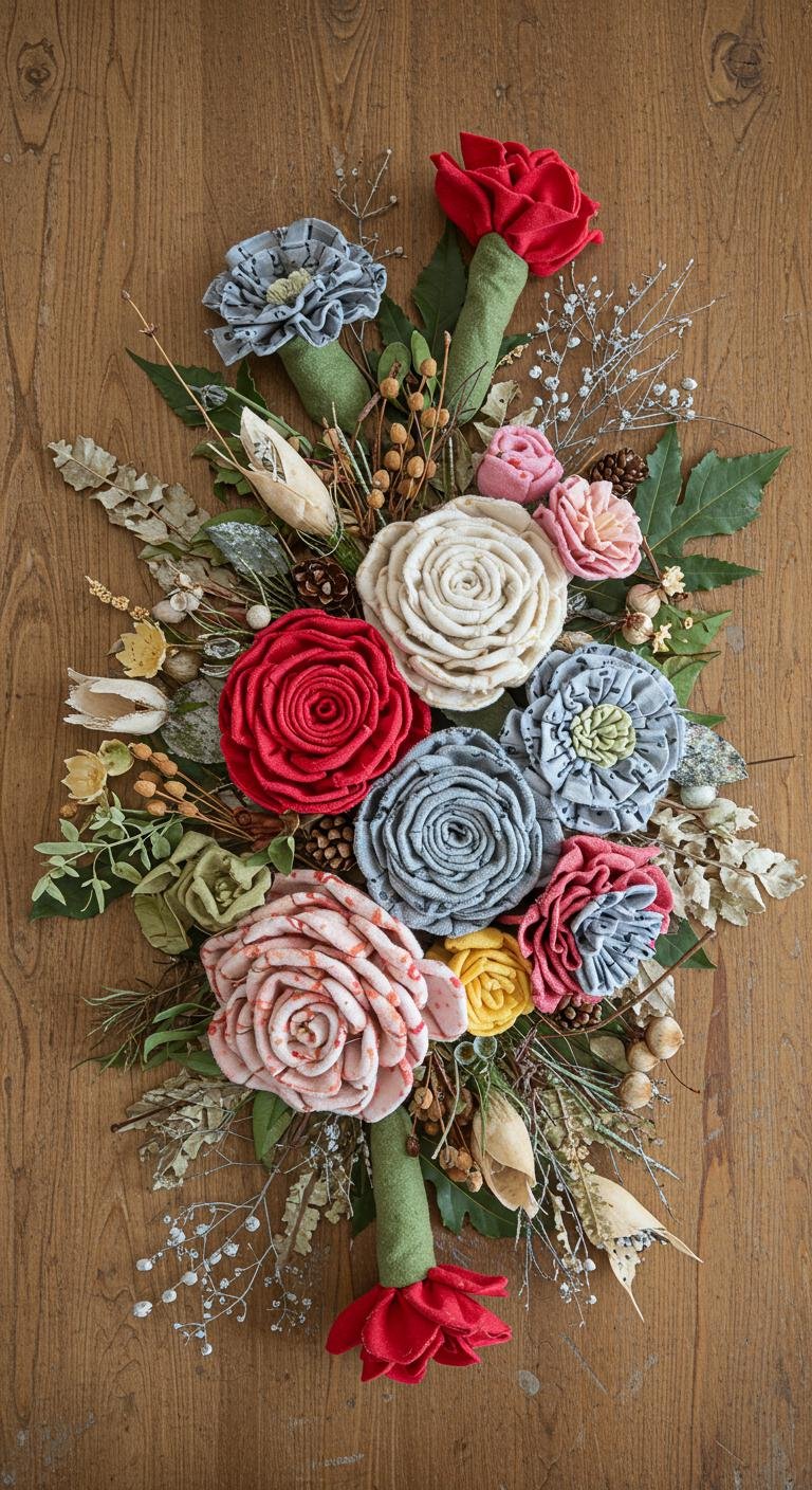Here’s a fun twist—fabric flowers! Using soft fabrics like linen or felt, you can cut out flower shapes and mix them with real greenery for a whimsical rustic look that doesn’t wilt. The textures of the fabric add that cozy, homemade vibe your guests will notice right away. You can sew them or just glue pieces together, making it a perfect budget-friendly craft to enjoy solo or with loved ones.