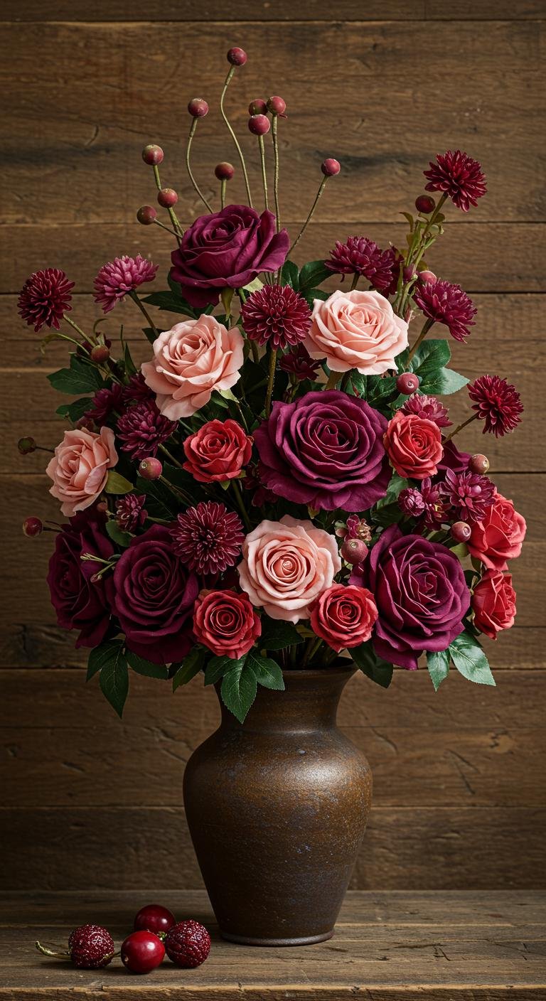 For a bit of sophisticated sparkle, try deco-inspired flowers in deep jewel tones like purples, greens, and golds. Pairing these rich colors with rustic ceramic vessels creates an amazing contrast that truly stands out. Local flower shops often have reasonably priced blooms in these shades, so you can mix elegance with rustic warmth. Layer your flowers with natural elements to give your arrangements extra depth and that wow factor.