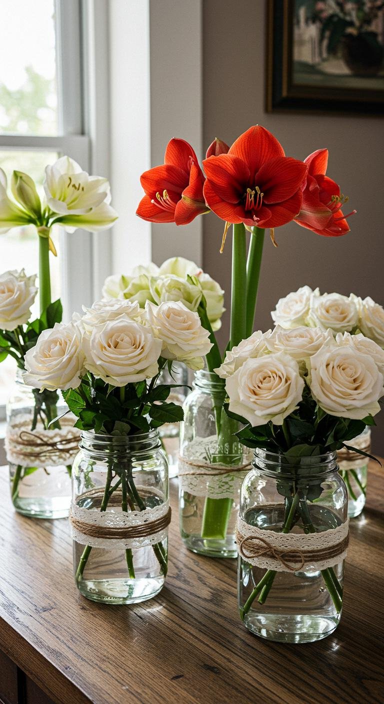 I can’t get enough of vintage glass jars—they add such a sweet, old-timey vibe to rustic flower displays. Throw in seasonal favorites like roses and amaryllis, and suddenly your décor feels fresh but with a classic twist. The best part? These jars are super easy to find at thrift stores or antique shops, and often really affordable. Wrap some twine or lace around each jar for a whimsical, handmade touch. Cluster them together or scatter them around your space to tie the whole room together effortlessly.