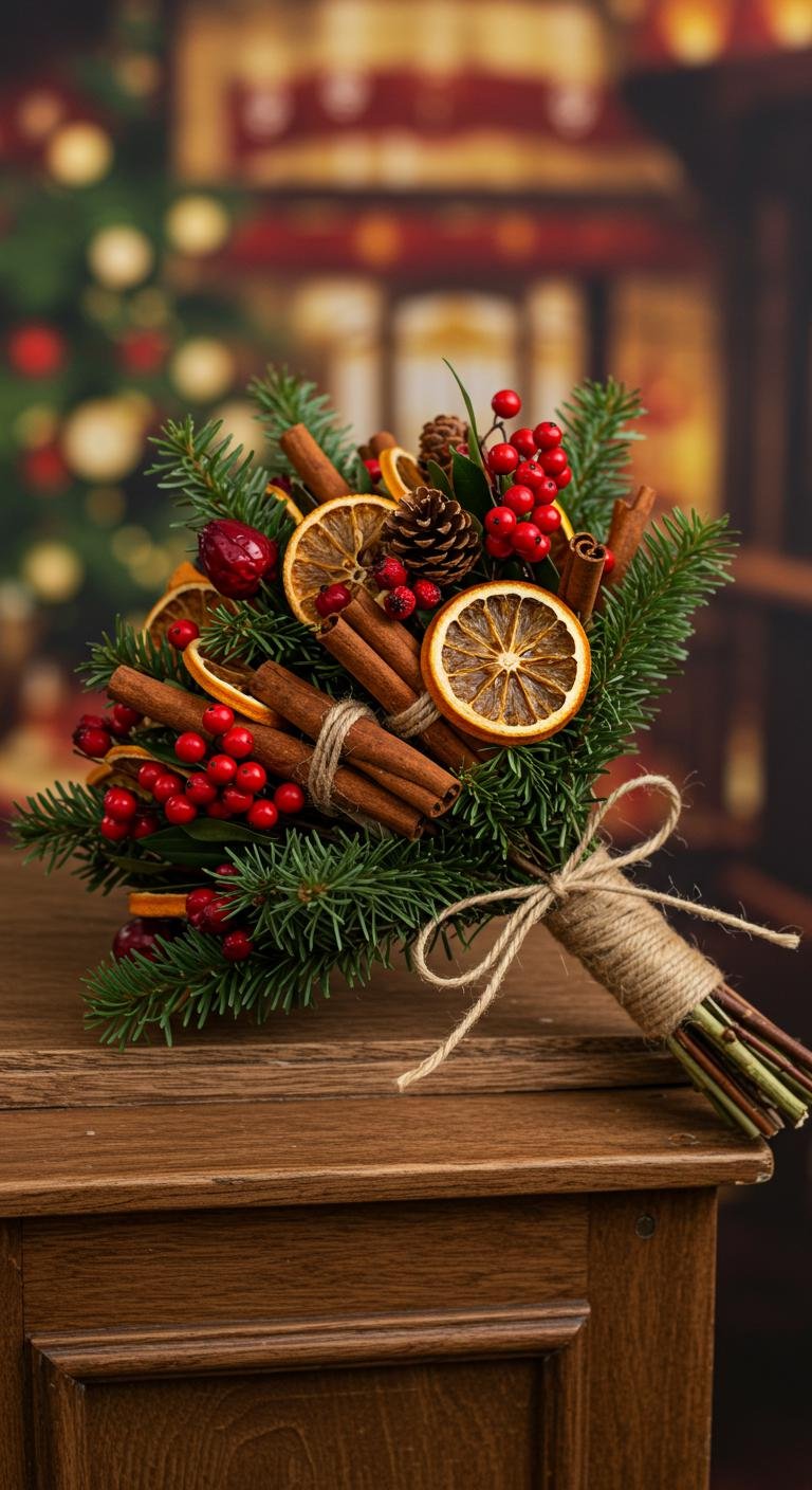 Want something that looks gorgeous and smells amazing? Try dried citrus slices paired with spices like cinnamon sticks and berry sprigs. It’s surprisingly easy: just dry your orange or lemon slices in the oven, then bundle them together with some twine. This bouquet not only looks festive but fills the room with those cozy holiday scents. Plus, it’s a smart, eco-friendly move since you’re reusing kitchen scraps rather than buying new stuff. A total win-win!
