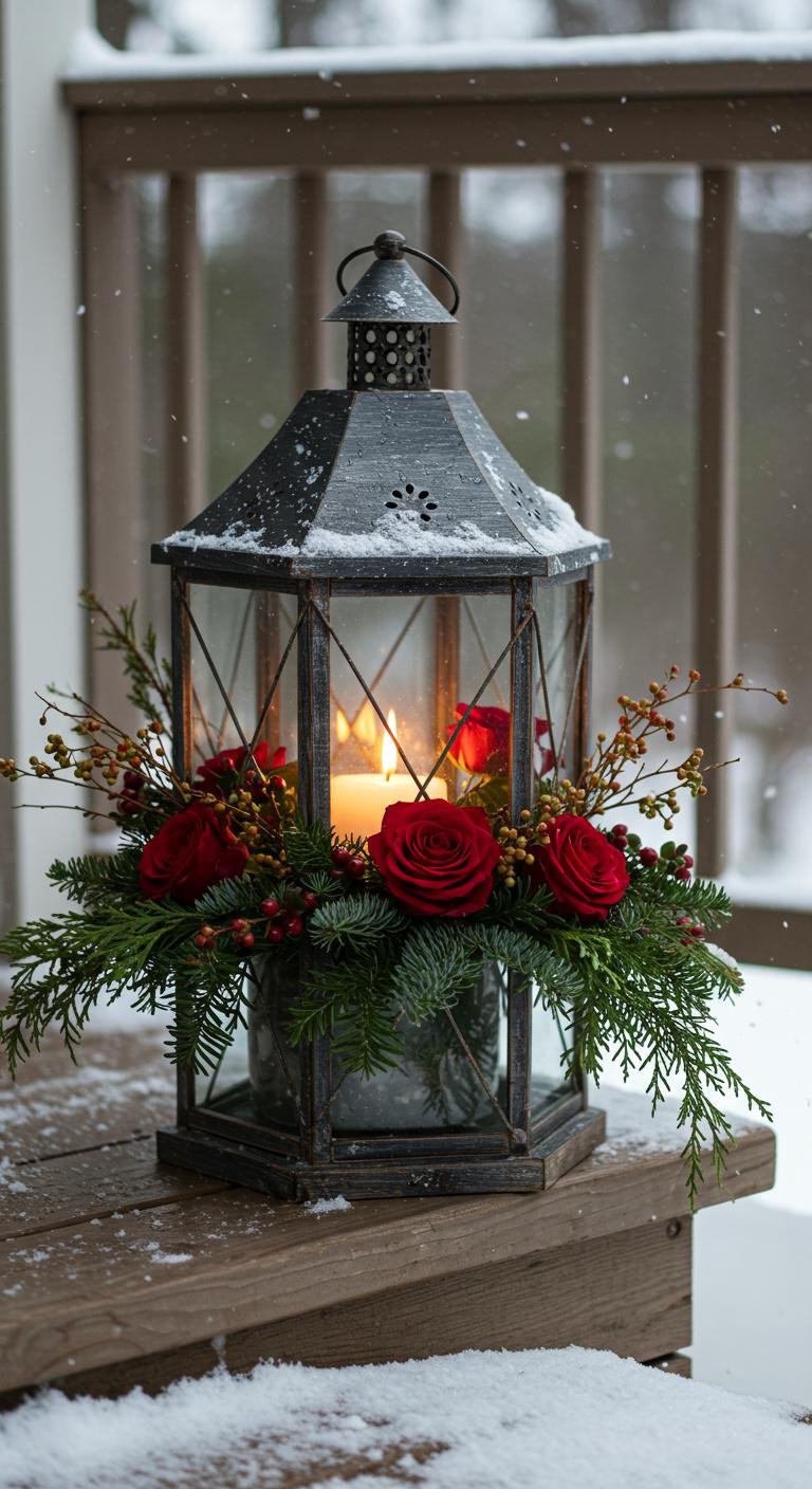 Rustic lanterns? Yes, please! They make stunning containers for seasonal flowers like red roses and evergreen sprigs. The contrast between the delicate blooms and the sturdy metal or wood adds this super cozy holiday charm. Group a few lanterns together to create a little festive corner that just glows with warmth. And don’t worry—you can snag affordable lanterns at thrift shops or get creative and DIY your own with repurposed materials. Perfect for brightening up any space!