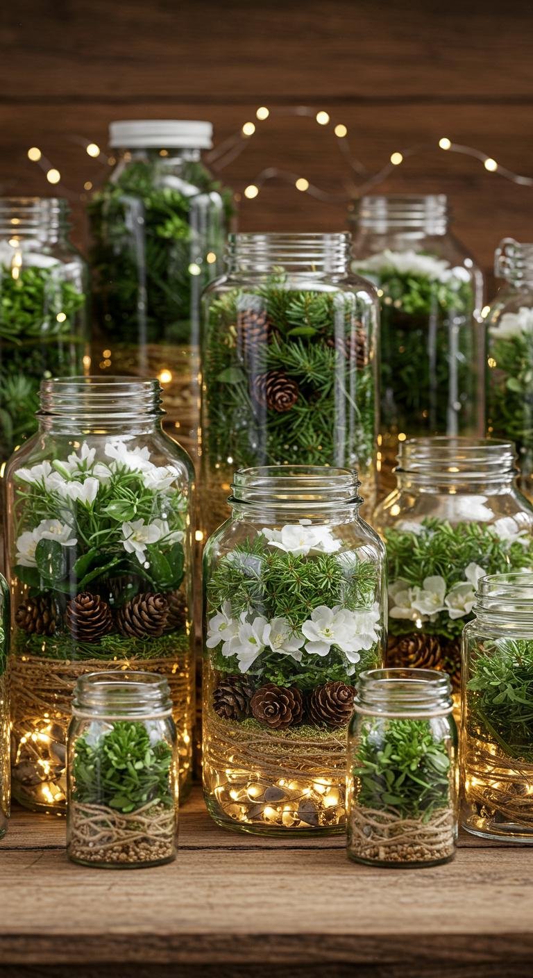 Layered jar arrangements are like rustic magic in glass. Grab different jars and layer evergreen foliage at the bottom, a bunch of white flowers in the middle, and top it all off with pinecones or berries. Playing with height and texture keeps these arrangements super dynamic and fresh. It’s a clever way to recycle jars from around your house or craft stores, definitely budget-friendly. These beauties look amazing spread out on a mantel or crowded together for a centerpiece vibe.