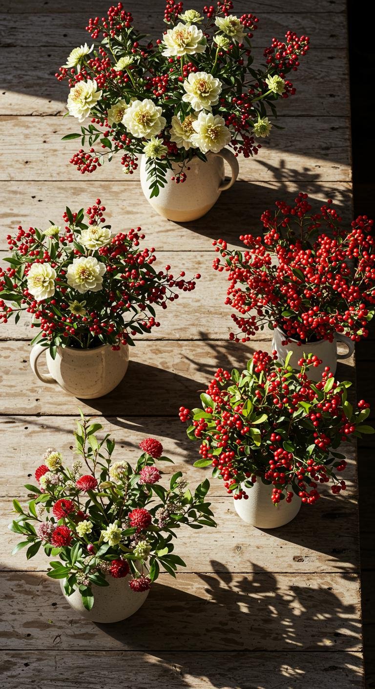 Mixing soft white roses or pastel blooms with bursts of red berries creates these utterly charming berry bouquets. Placing them in rustic pottery or simple vases really amps up that homespun feeling. It’s an easy DIY that doesn’t cost a ton if you hit up local markets or grow your own. Tip: introduce some dried flowers to your mix for a lasting arrangement that keeps your holiday spirit alive way past December.