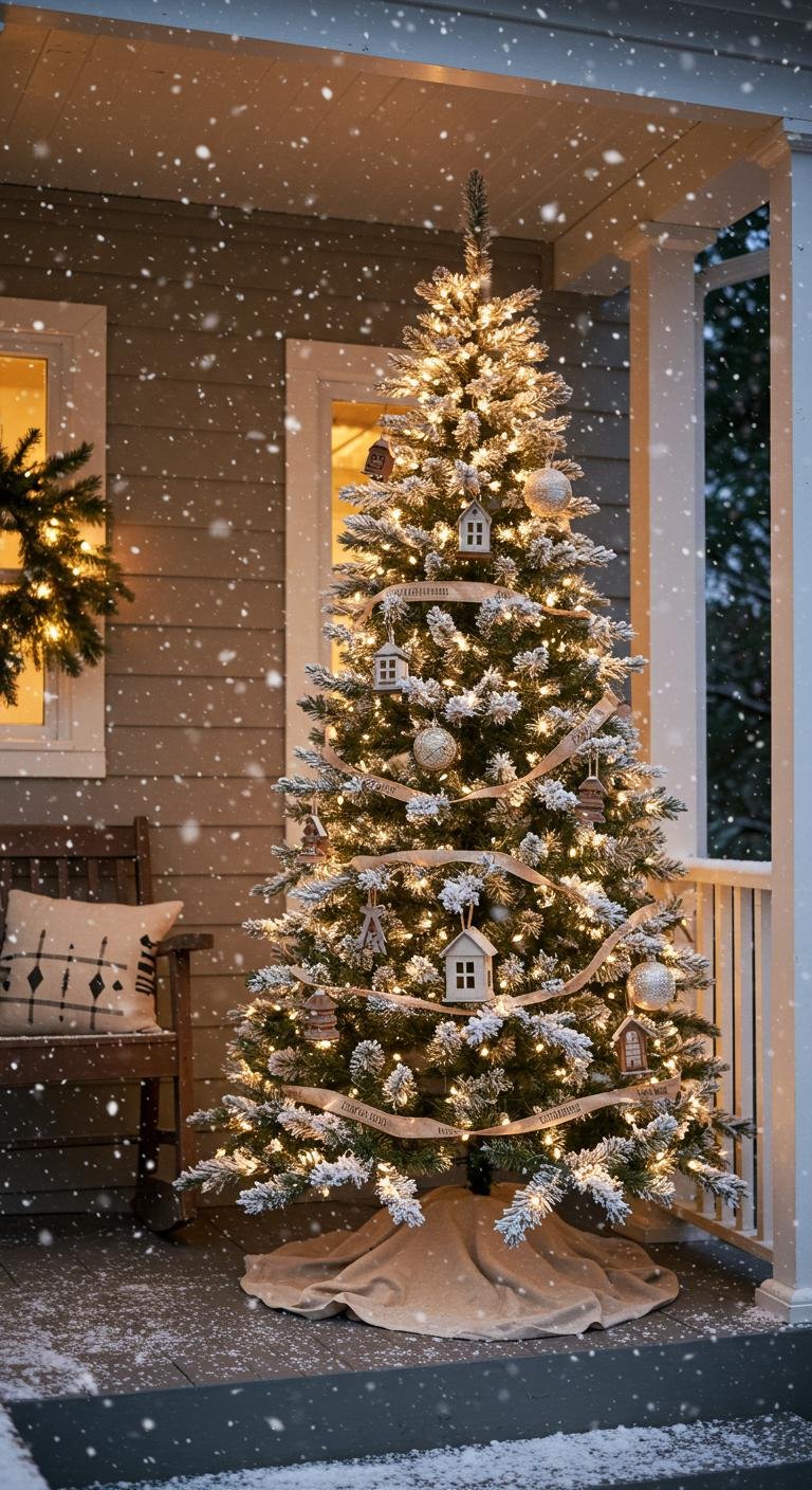 Want to make your porch look like a scene from a snowy winter dream? Try a flocked Christmas tree! You can buy one or get creative and DIY some snow spray at home for that frosted look. Add rustic ornaments, burlap ribbons, and twinkly lights to keep the theme consistent. Toss in a few handmade touches and it’ll look like your porch stepped right out of a holiday postcard.