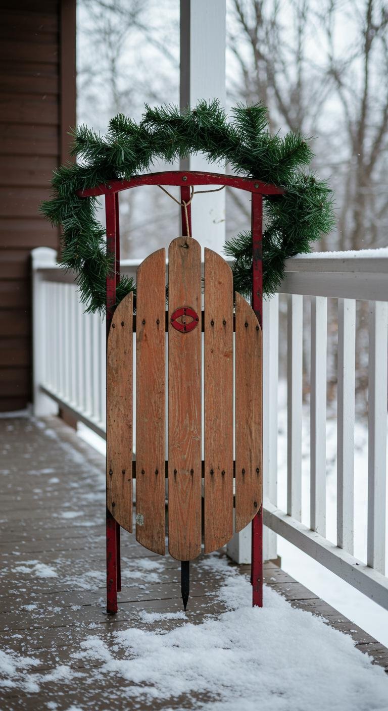 You don’t need a big budget to make vintage sleds part of your porch story. Lean one against the wall or set it down as a base for potted plants or other decor. If you don’t have an actual sled, no stress — you can DIY one using reclaimed wood. Wrap it in garlands or strings of fairy lights and watch it become an instant focal point that brings nostalgic charm.