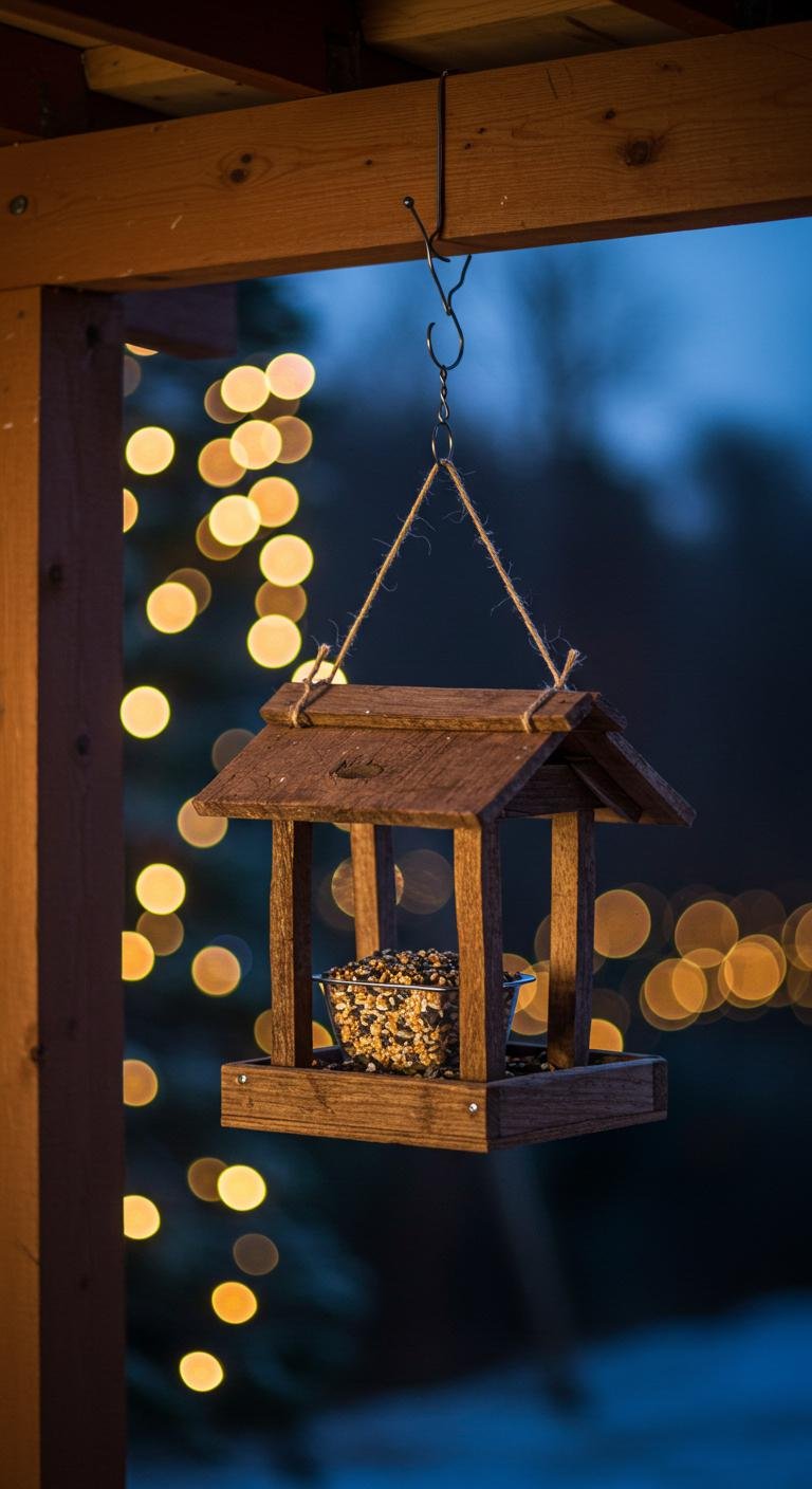 Why not invite some feathered friends for the season? Making rustic bird feeders from wooden pallets or reclaimed wood is pretty straightforward. Fill them with birdseed and hang them right on your porch or nearby trees. They’re a charming touch that livens up your porch and gives you a little nature show to enjoy during those quiet winter days.