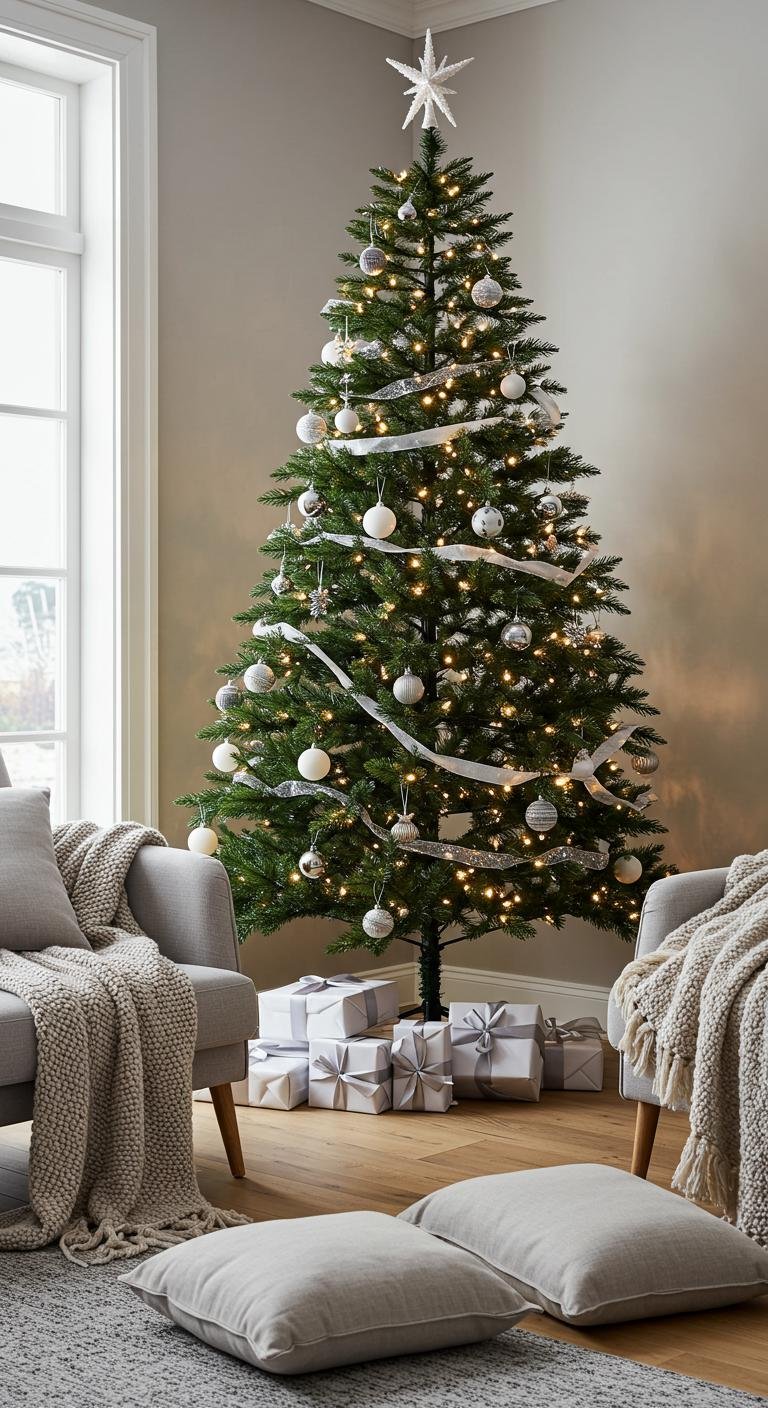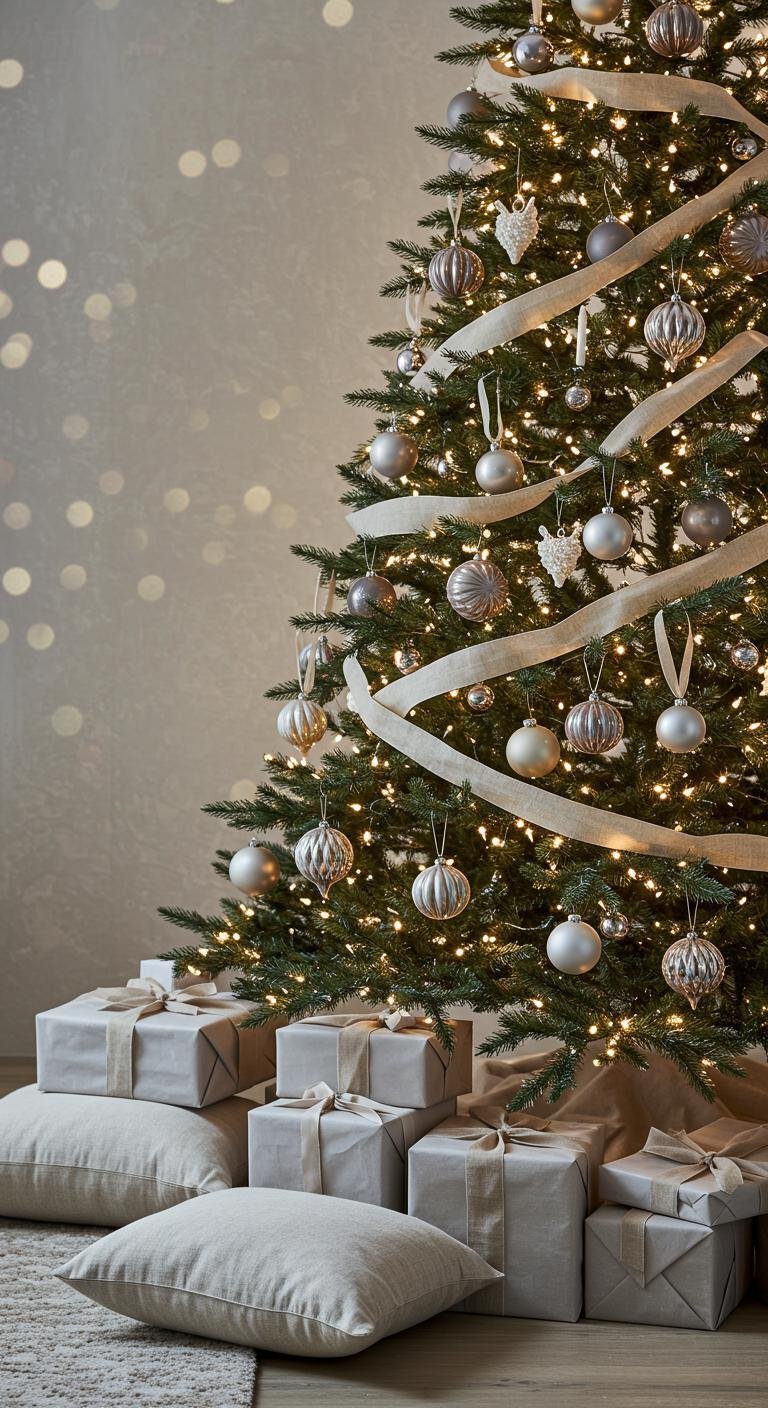 If you want your tree to whisper sophistication, soft grays and beiges are your new best friends. These gentle shades create a calming backdrop that’s oh-so-elegant. Matte ornaments and linen ribbons add just the right amount of texture—nothing too shouty. Feeling thrifty? Grab some felt or fabric scraps and whip up DIY bows or ornaments. It’s all about those subtle touches that turn your tree into a serene holiday haven where everyone feels totally at ease.