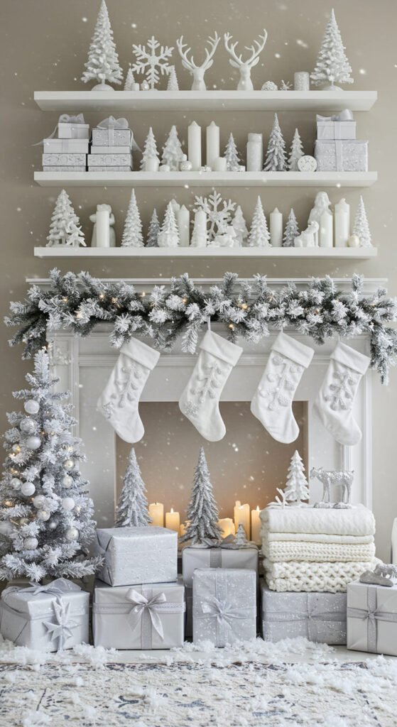 Picture white garlands draping from shelves, delicate snowflake ornaments swirling in the air, and cozy throws mimicking soft drifting snow.