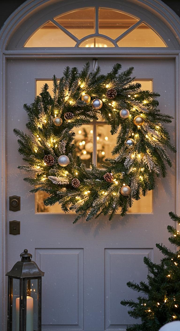 Transform your front door into a festive focal point with frosted wreaths adorned with glimmering fairy lights.
