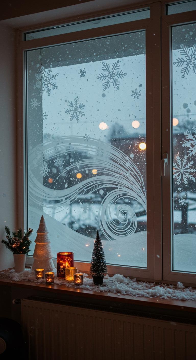 Using simple frosted glass techniques, you can create a whimsical winter wonderland. Just mix Epsom salt with water, apply it to glass surfaces, and watch as it sparkles like freshly fallen snow—adding a magical touch that captures the spirit of the season beautifully.