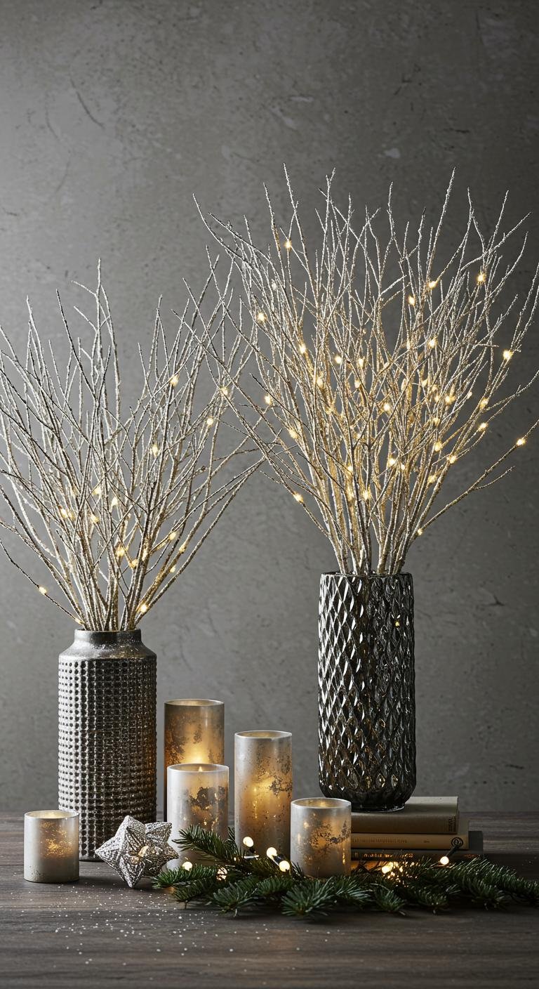 Transform your holiday decor with frosted branch arrangements that evoke the serene beauty of a snowy forest.