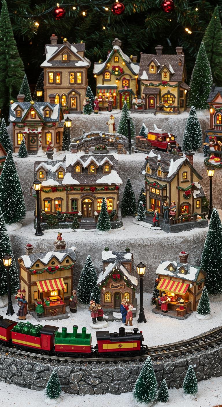 Picture tiny snow-covered houses, twinkling lights, and a charming miniature train winding through the scene.