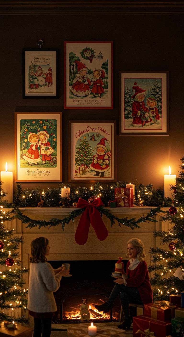 Five vintage Christmas cards displayed in charming frames can instantly evoke nostalgia and add a touch of whimsical warmth to your holiday decor.