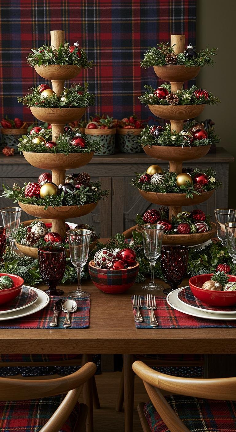 Consider diverse tartan centerpiece styles, from traditional bowls filled with ornaments to chic, layered designs with greenery.