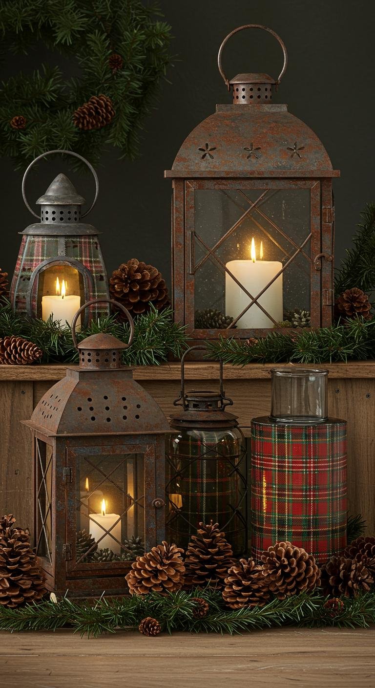 Incorporating lanterns into your holiday decor can enhance the inviting ambiance created by tartan pinecone arrangements.