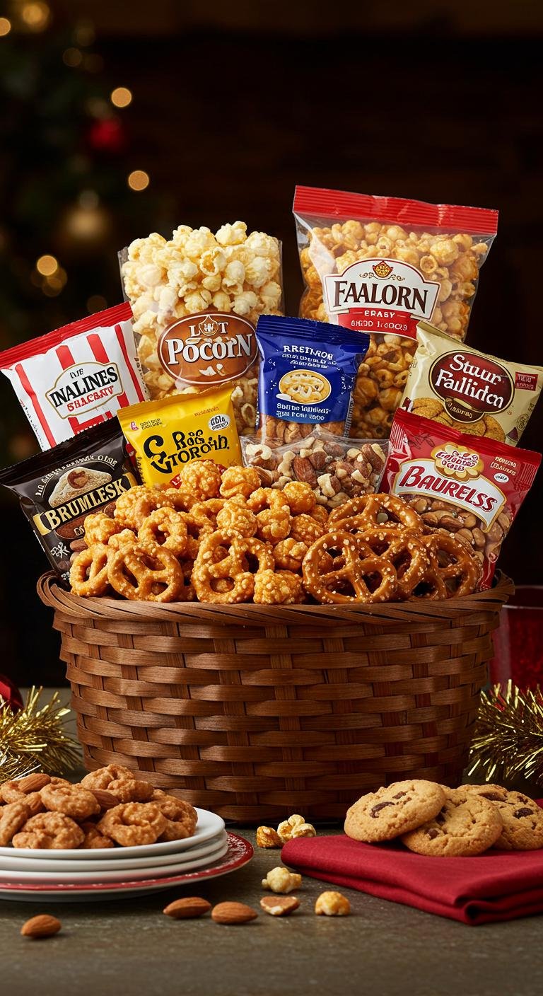 Everyone loves a good snack basket. Fill it with a mix of sweet and savory treats like gourmet popcorn, pretzels, and assorted cookies. Throw in some local favorites or seasonal goodies to make it special. This basket is super easy to pull together with finds from local shops or farmers’ markets. It’s basically a party in a basket and perfect for any holiday hangout.