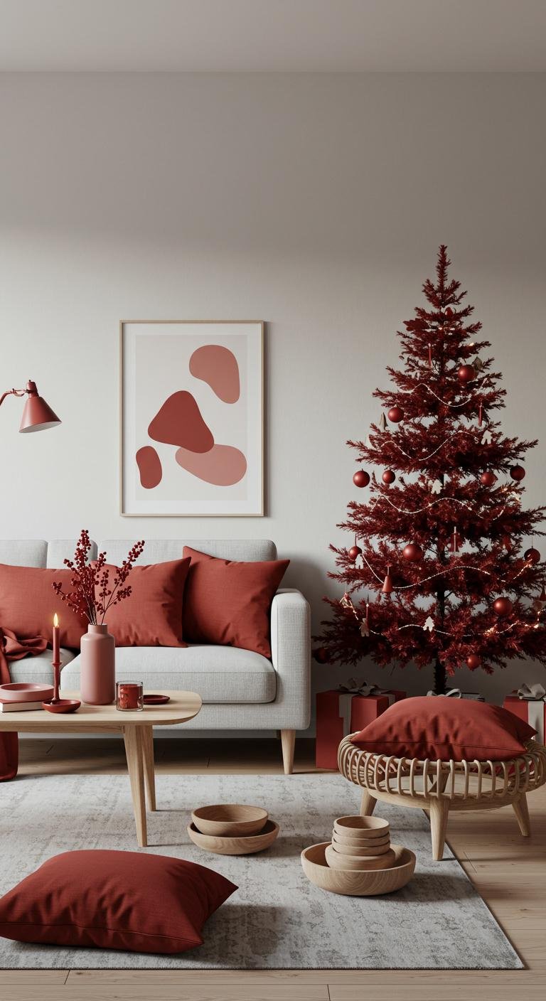 The Scandinavian rustic trend is all about muted reds and natural touches like wood and greens for a calm but festive vibe. Soft textiles and handmade decorations, like carved wooden pieces, bring character. Grab twigs or pine branches from outside to complete the look—it’s super eco-friendly and easy on the wallet, plus feels really authentic and peaceful.