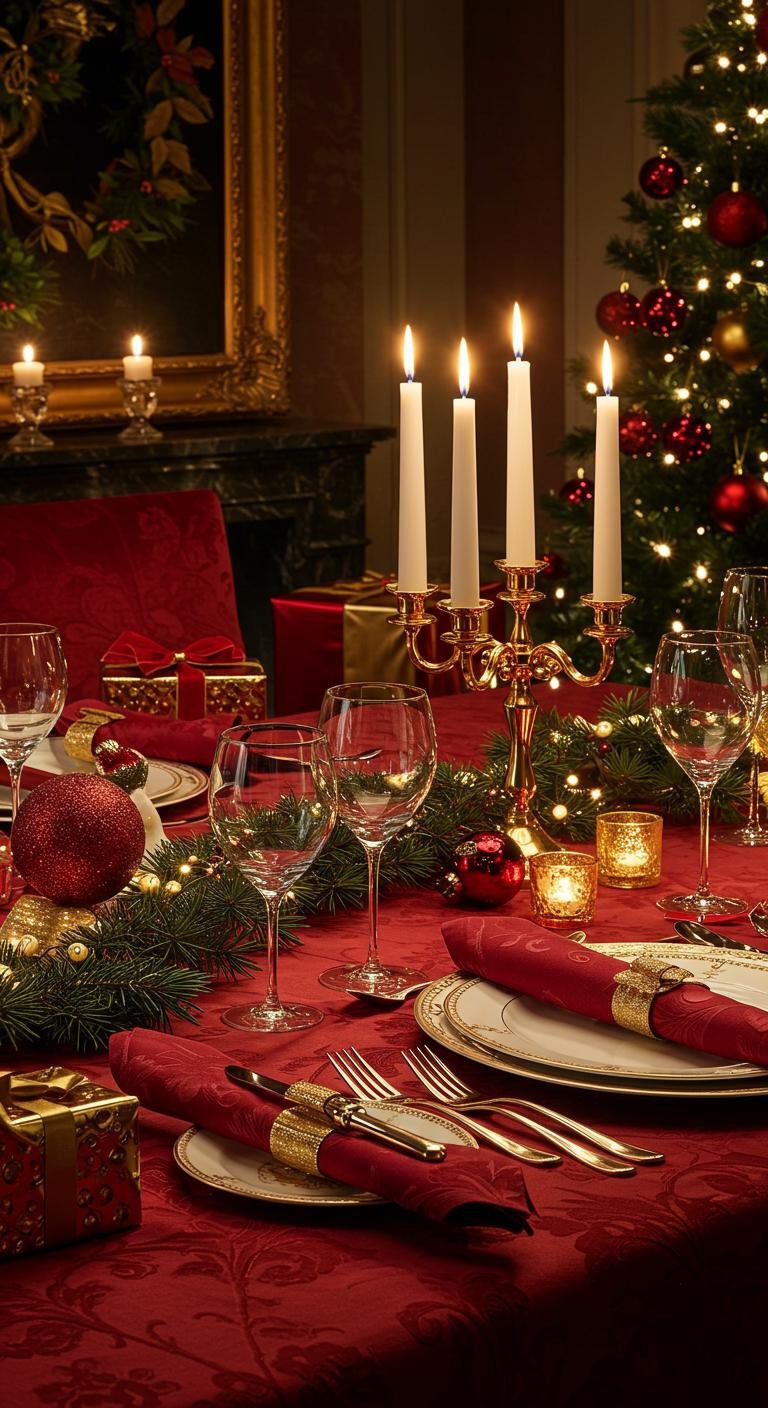 For a bold, elegant holiday vibe, pair your reds with shimmering gold. Think gold-glittered ornaments on a radiant red tree, a dining table dressed with gold flatware against rich red runners, and candle setups with golden accents. You can even craft gold-painted branches to sprinkle around your table or mantel. It’s the kind of look that instantly feels festive and sophisticated.