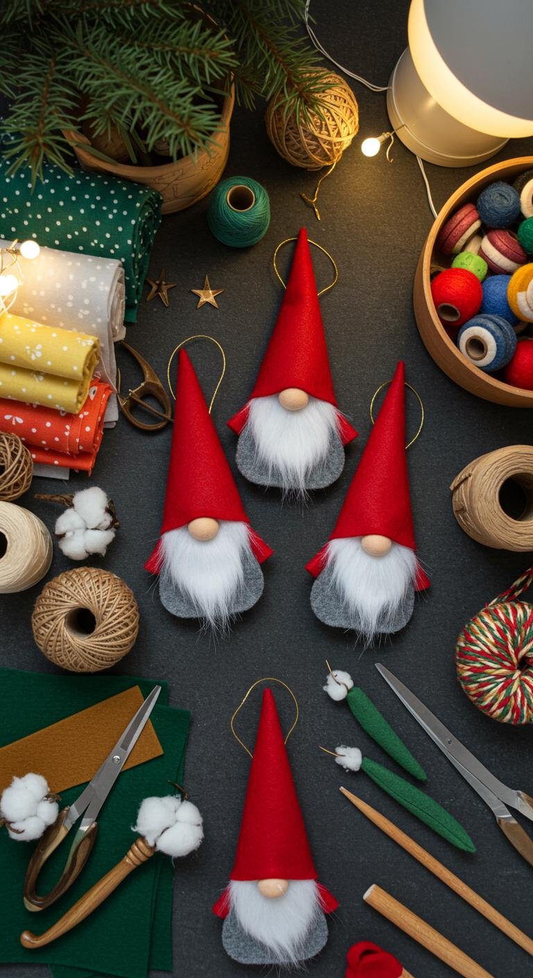 Craft tiny gnome friends using felt and fabric scraps. Cut out all the parts—body, hat, beard—and glue or sew them into place. Sprinkle on beads or buttons for eyes, stuff with cotton for fluff, and add little personality touches. It’s a super fun project for kids and adults alike, and these gnome pals make your tree feel extra whimsical and homey.
