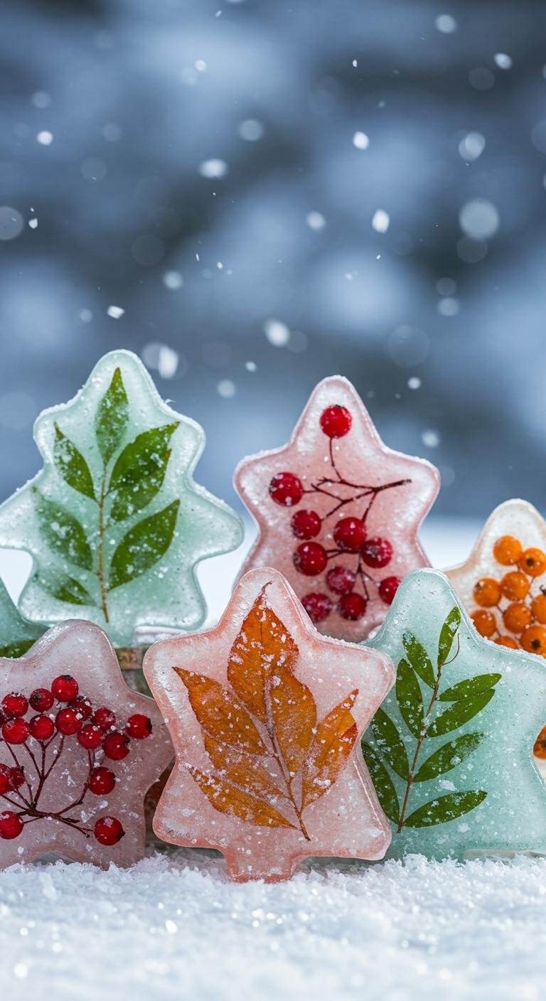 Here’s a cool (pun intended) idea: make ice ornaments! Fill silicone molds with water and tuck in leaves, berries, or twigs before freezing overnight. Hang these outside where they can glisten as part of a winter wonderland. They’re a beautiful, temporary art piece that melts back into nature, making this project both fun and educational—perfect for kids to learn about freezing and natural textures.