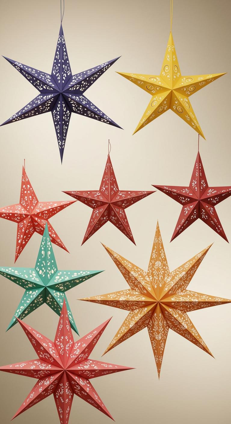 Everyone loves stars, right? Cut colorful paper into star shapes and fold them to pop out in 3D. Glue or tape them so they stay just right, and mix sizes for an eye-catching display. This one’s great for using up leftover wrapping paper, and it’s a fun way to get kids involved. Scatter these sparkling stars around your home and let them add a magical, whimsical vibe to your holiday scene.