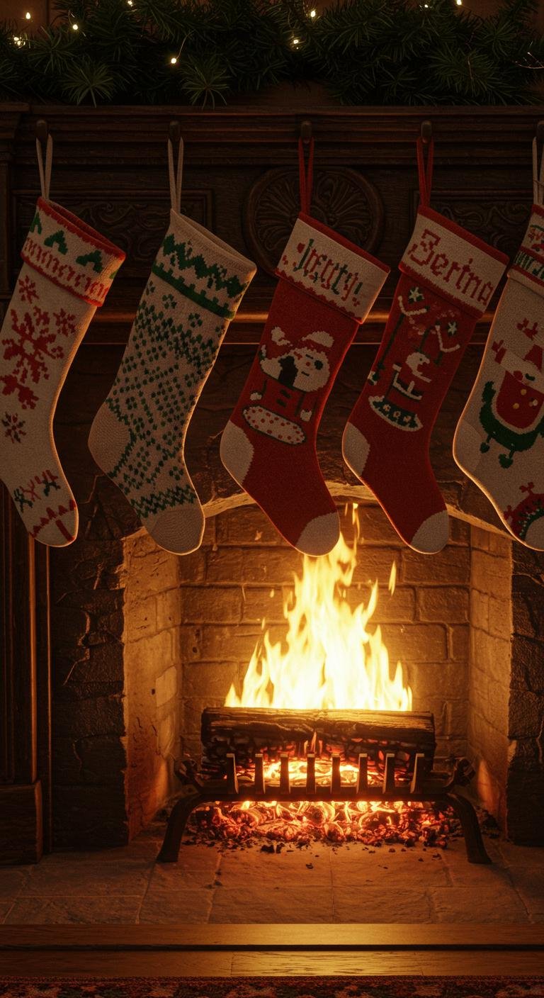 Vintage stockings add a charming touch to your holiday decorations, instantly transforming your space into a nostalgic wonderland. With various vintage stocking styles, like knitted or embroidered designs, you can revive cherished holiday stocking traditions. Hang them by the fireplace or on the wall, letting each stocking tell a story that invites warmth, joy, and the holiday spirit into your home.