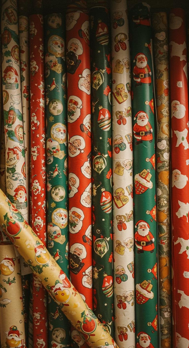 Colorful rolls of retro wrapping paper bring a delightful charm to your presents, celebrating the spirit of the season with nostalgic patterns and vibrant prints.