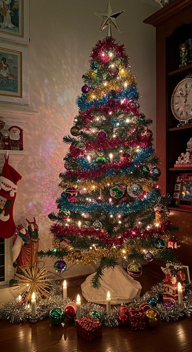 Color wheels are such a fun vintage accessory. These little devices cast rotating colors around your tinsel tree, creating a lively, colorful light display that feels straight out of the past. If you’ve got a vintage one, make sure it still works before setting it up. No luck? No worries—there are modern versions that deliver the same magical effect with no fuss. Just plop it at the tree’s base and watch the colors dance!