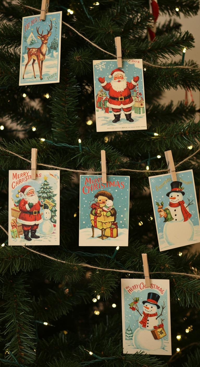 Here’s a sweet way to add maybe the most personal touch: hang vintage Christmas cards right on your tree. They bring back memories and share little stories of past holidays and loved ones. Use twine or pretty ribbon to string them up, securing each card with a small paperclip or clothespin. If you have handmade cards from friends and family, showcasing those makes your tree feel even more heartfelt and warm.