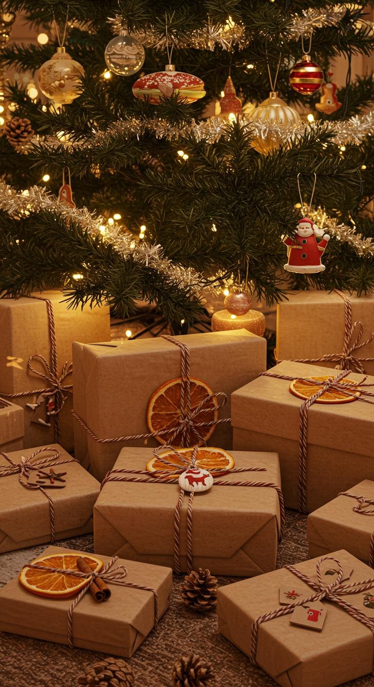 Gifting is part of the holiday magic, so why not make your presents look just as vintage and cozy? Brown kraft paper, twine, and dried flowers go a long way in creating that warm, handmade feel. Add some stamps or hand-painted patterns for a little extra charm. These materials are easy to find and inexpensive, and homemade gift tags give each present a unique touch that fits right in with your nostalgic tree.