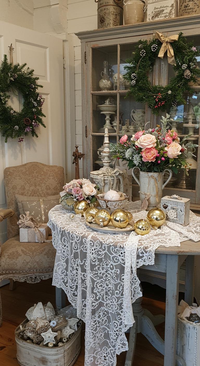 Soft muted colors paired with lace and linen bring that understated French country elegance into your Christmas setup. Vintage glassware or coastal-inspired sea shell ornaments add unique character. If funds are tight, easy DIY fabric accents from inexpensive linens or lace can make your holiday table or displays feel extra special without much fuss.