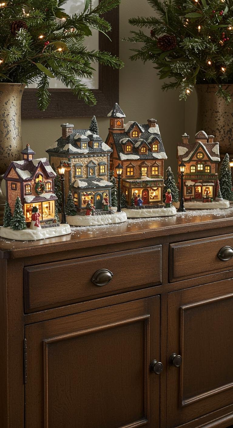 Remember those tiny Christmas villages from childhood? They’re back and so heartwarming. Collect miniature ceramic houses or make your own from cardboard and paint for a sweet personalized display. Add bottle-brush trees to complete the look. Hit thrift stores or online marketplaces for affordable pieces, and arrange them on mantels or sideboards to create a charming winter scene that’s all yours.
