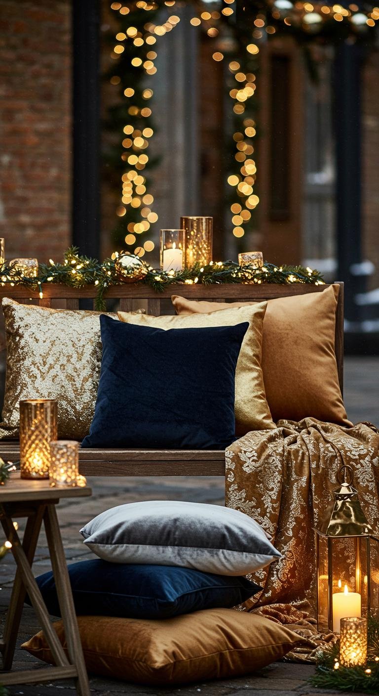 Velvet and burnished metallics hit just the right note between rustic and elegant. Think velvet pillows and throws for your outdoor seating, plus metallic trays and decor pieces that catch the light beautifully. You can find lots of budget-friendly options at thrift stores, meaning you’ll create a cozy vibe without splurging. It’s all about mixing comfy textures with that subtle holiday glow.