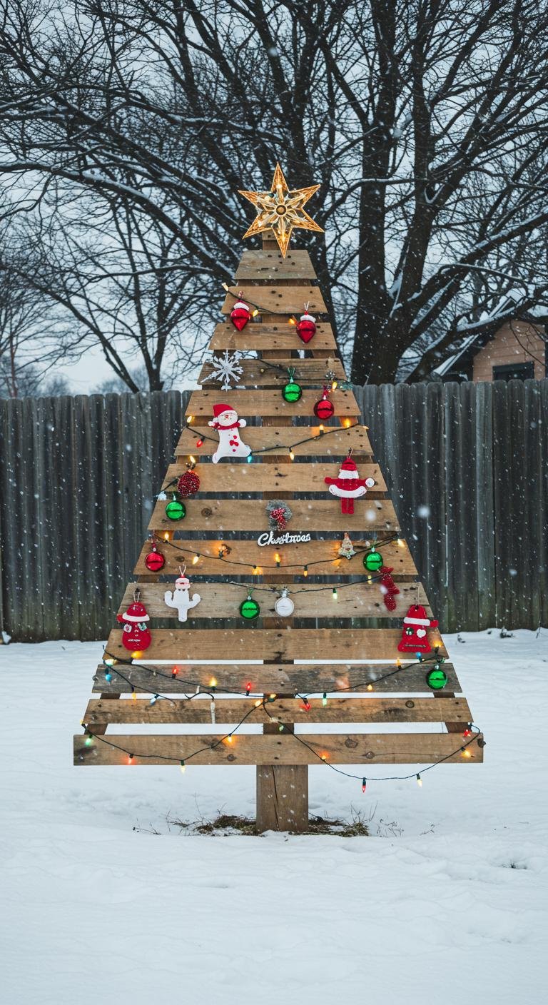 If you’re into sustainable and whimsical decor, pallet wood Christmas trees are where it’s at. All it takes is snagging some free or cheap pallets, cutting them into a tree silhouette, and painting or staining however you like. Then decorate with lights, ornaments, or even hand-painted signs. They fit nicely in any yard and prove you don’t need to spend a ton to get fabulously festive.