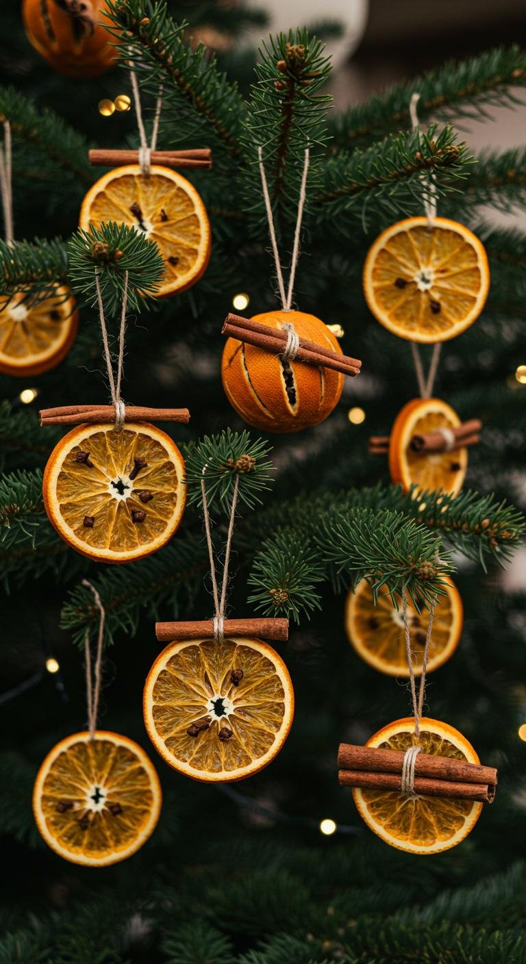 Adding scented elements is like giving your tree a secret superpower. Think dried orange slices, cinnamon sticks bundled with twine, or cloves tucked into tiny bundles. These natural touches fill your space with all the cozy holiday smells and feel perfectly rustic. They’re easy to make too—just dry your citrus slices in the oven at low heat and you’re set. Hanging them with string or ribbon blends seamlessly into vintage-themed decor while welcoming everyone with those warm, fuzzy scents.