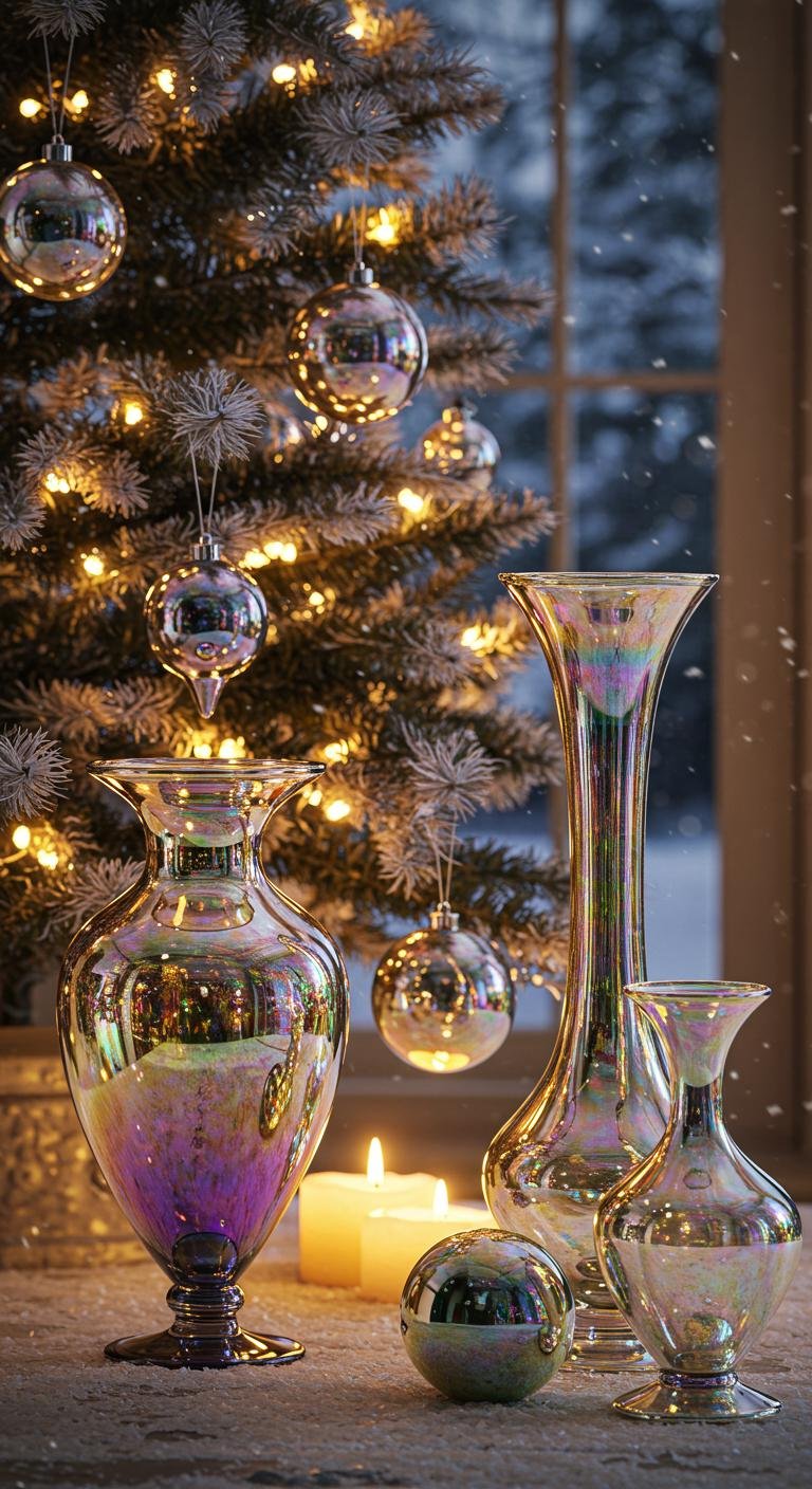Fill your home with iridescent glass vases, their delicate curves capturing the essence of winter’s beauty.