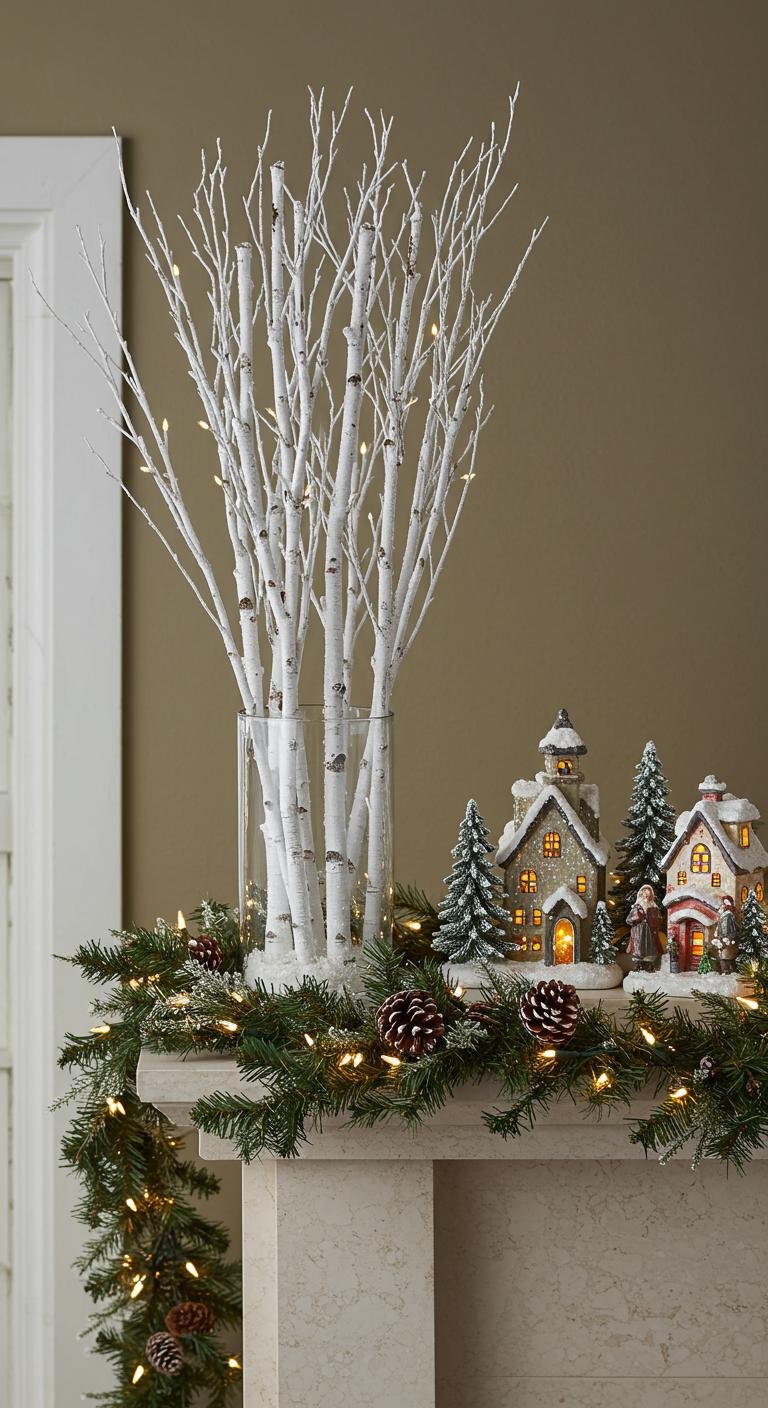 Adding white birch branch accents to your holiday decor enhances the enchanting atmosphere established by snowy village figurines.