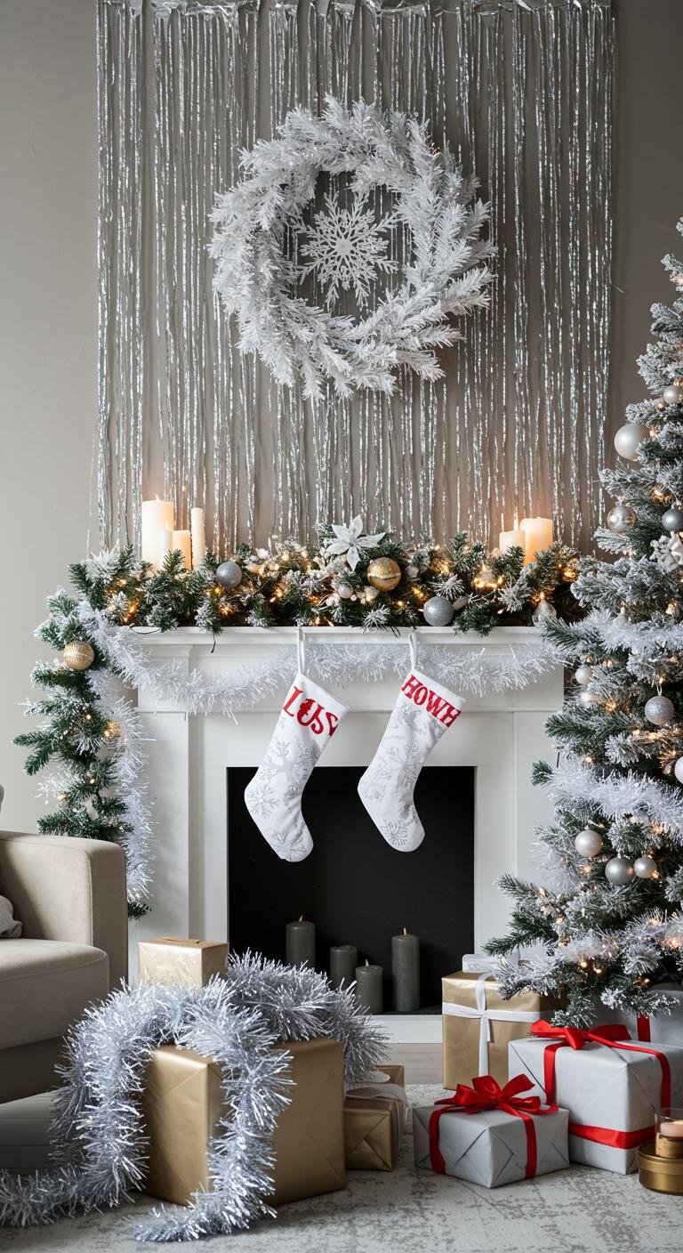 Elegantly draping your home in shimmering white tinsel brings a magical touch that perfectly complements your Winter Wonderland Wreath. This year, embrace the latest shimmering tinsel trends to infuse your space with a festive spirit. Picture cascading layers of glistening strands adorning mantels and tree branches, transforming ordinary rooms into ethereal retreats filled with warmth and light—truly enchanting festive decor ideas for your holiday celebration.