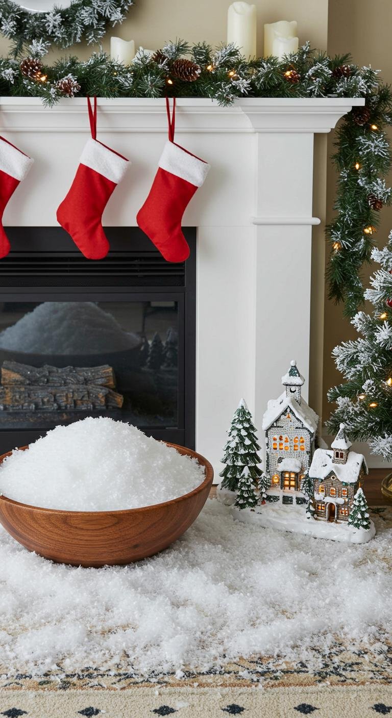 Imagine snowy landscapes brought indoors with the enchanting allure of artificial snow decor.
