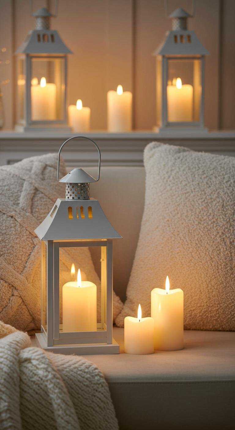 As the cozy ambiance of plush white throw pillows envelops your living space, white lanterns with candles offer a perfect complement, casting a warm glow that enhances the winter wonderland feel.