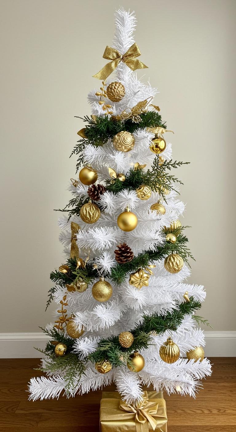If a traditional tree isn’t your scene, why not shake things up with a unique shape? Wooden frames or wall-mounted trees add a cool, modern dimension while saving precious floor space. Stoke your white and gold theme by decorating with matching lights and ornaments. This unexpected approach feels fresh and totally personalized—perfect if you’re craving something a little different.