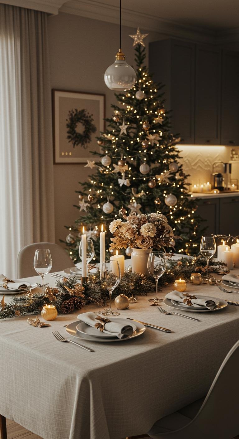 Not everyone has room for a big tree, and honestly, tabletop trees are just as charming! A petite neutral tree on your dining table or mantel can become the festive heart of your space. Keep the decorations small and sweet—tiny white and cream ornaments, little lights to sprinkle some sparkle. You can even coordinate a whole themed table setting around your mini tree for extra holiday magic.