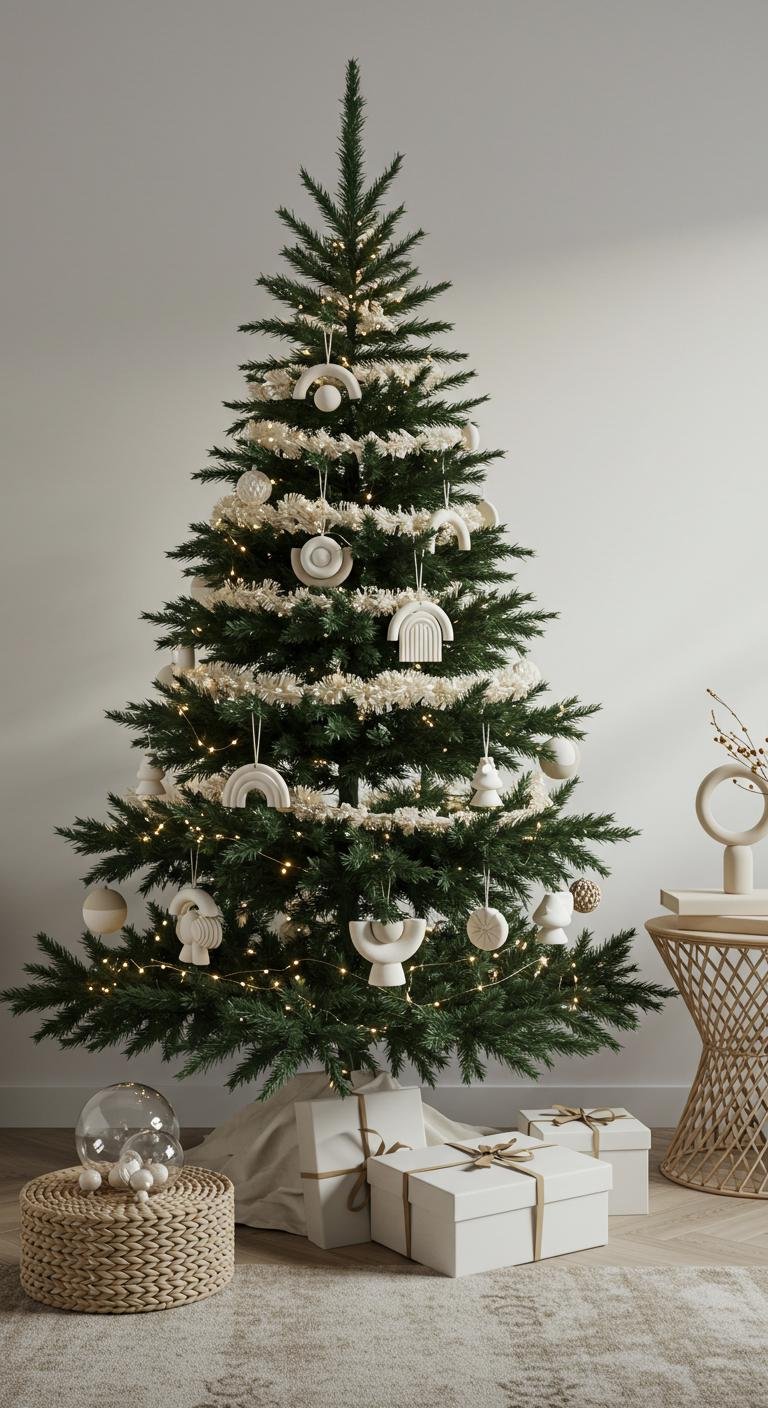 If you’d rather go sleek and edgy, try decking your tree out with abstract or artistic ornaments. Think sharp shapes, clean lines, and lots of white paired with metallic accents. You can DIY lightweight art ornaments or pick up some simple pieces that fit your style. It’s such a cool way to blend creativity with that peaceful neutral palette, giving your tree a serious wow factor.